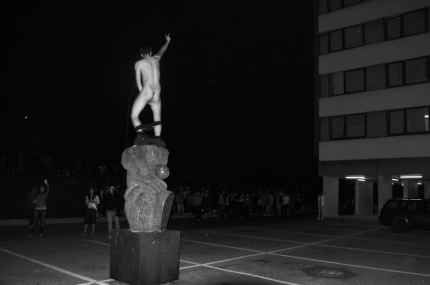 Léta páně 2012 - poslední duben - grilování čarodějnic. Po značné míře vypitého alkoholu jsem byl zákeřně vyhecován vylézt na sochu na parkovišti u bloku D a se spodním prádlem na půl žerdi zamávat všem, co si celý den na harcově grilovali klobásky.