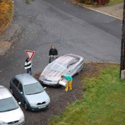 Jednou jsme pozorovali tyto týpky jak obalují někomu auto fólií. Nejprve nám to přišlo velmi vtipné, hlavně den nato kdy polovina aut na parkovišti byla pečlivě zabalena. Bohužel včetně mého! Tak už mi to vtipné nepřišlo a byl jsem nazlobený.
