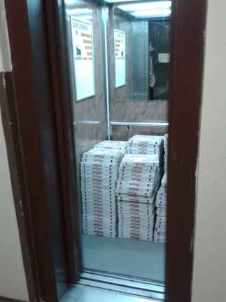 Takhle jsme na konci semestru vyklidili pizzové krabice z našeho pokoje. Zřejmě se celou noc vozili výtahem.